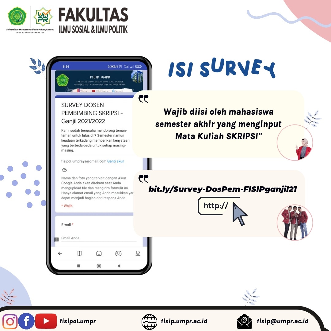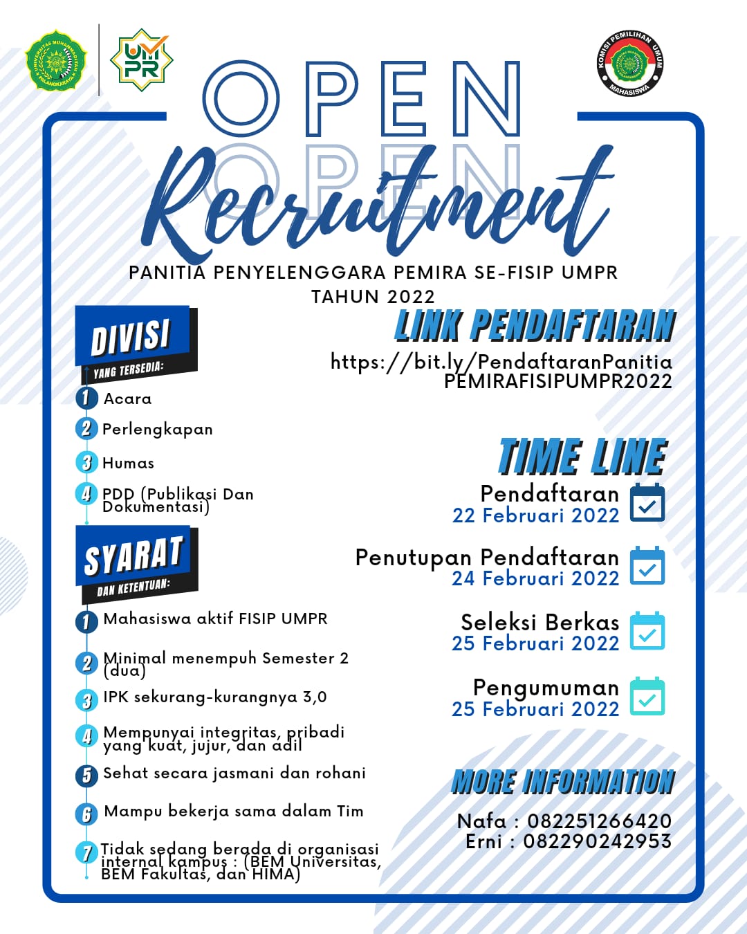 Halo, warga FISIP ! “Pemimpin tak lahir karna ijazah, tapi oleh kerja keras dan kepedulian yang terus diasah” -Najwa Shihab Oleh karena itu, mengajak kawan-kawan mahasiswa FISIP UMPR tergabung dalam panitia penyelenggara Pemilihan Raya Se-FISIP UMPR Tahun 2022 Persyaratan : ✅ Mahasiswa aktif FISIP UMPR ✅ Minimal menempuh Semester 2 (dua) ✅ IPK sekurang-kurangnya 3,0...Read More