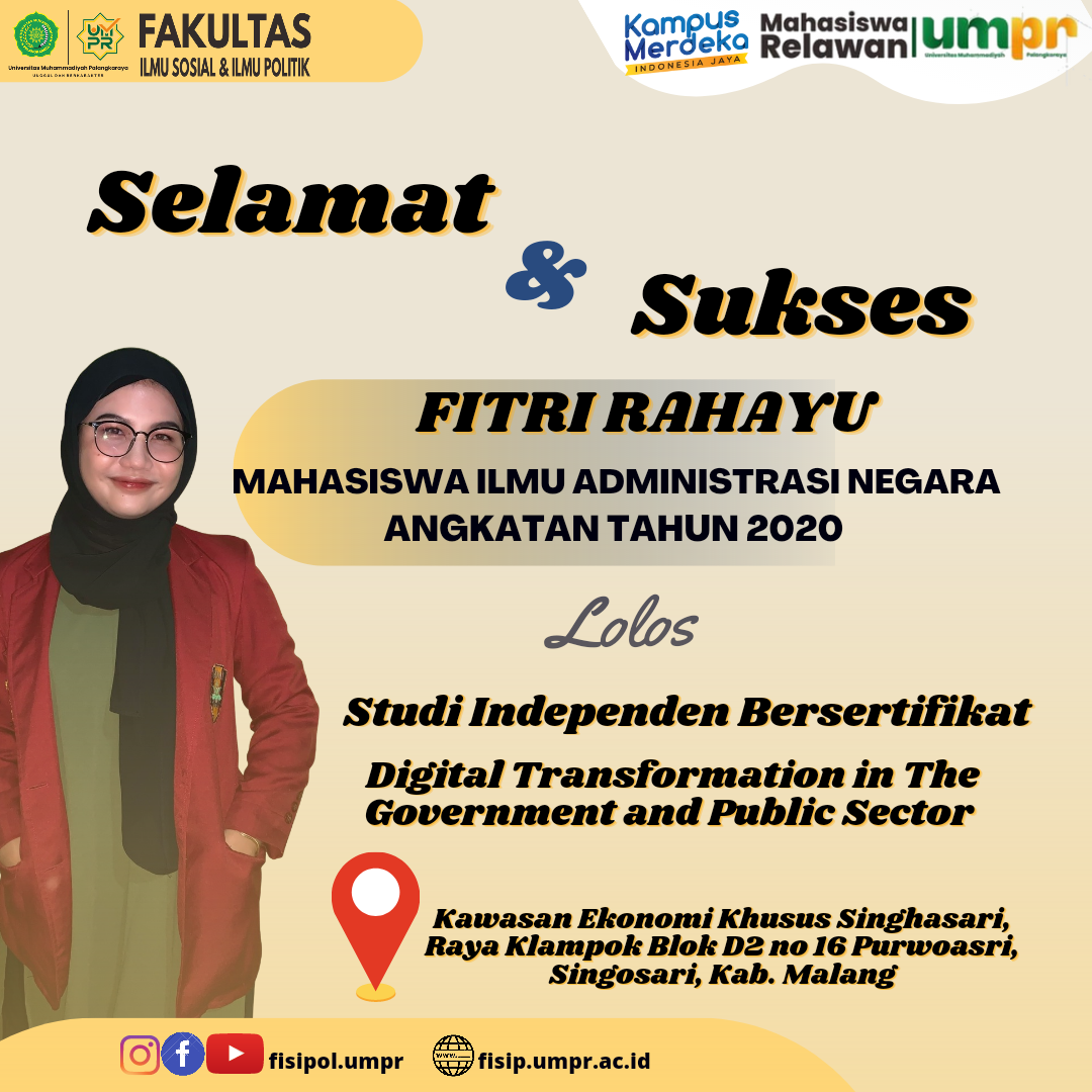 Halo, Kawan-kawan FISIPOL Excellence… Kami sangat bangga atas pencapaian kawan-kawan mahasiswa yang terus menerus meraih pengalaman dan prestasi. Kami ucapkan selamat dan sukses untuk *Fitri Rahayu Mahasiswa Aktif Program Studi Ilmu Administrasi Negara yang Lolos Studi Independen Bersertifikat* “Digital Transformation in the Goverment and Public Sector” di kawasan Ekonomi khusus Singhasari, Singosari, Kabupaten Malang, Jawa...Read More
