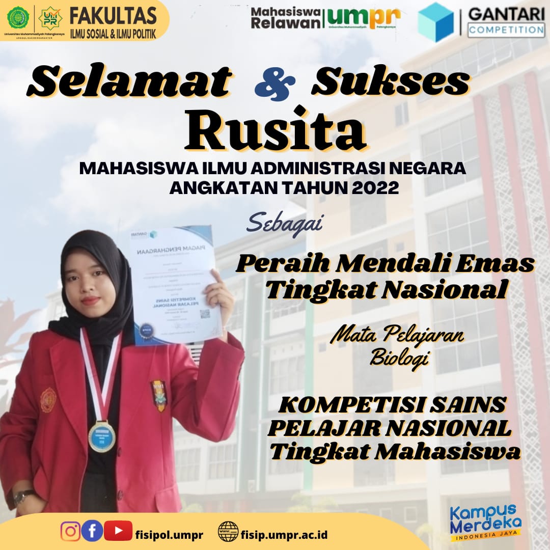 Halo, Kawan-kawan FISIPOL Excellence… Kami sangat bangga atas pencapaian kawan-kawan mahasiswa yang terus menerus meraih pengalaman dan prestasi. Kami ucapkan selamat dan sukses untuk Rusita Mahasiswa Aktif Program Studi Ilmu Administrasi Negara sebagai Peraih Mendali Emas Tingkat Nasional dalam Kompetisi SAINS Pelajar Nasional Tingkat Mahasiswa dalam Mata Pelajaran Biologi yang diselenggarakan GANTARI COMPETITION 2023. Kami...Read More
